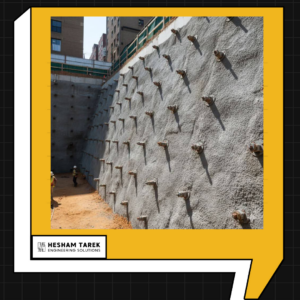 تقنية تعتمد على إدخال قضبان حديدية (Nails) داخل كتلة التربة ثم رش الوجه بالخرسانة المقذوفة (Shotcrete). حل ذكي واقتصادي في التربة الصخرية أو المتماسكة.