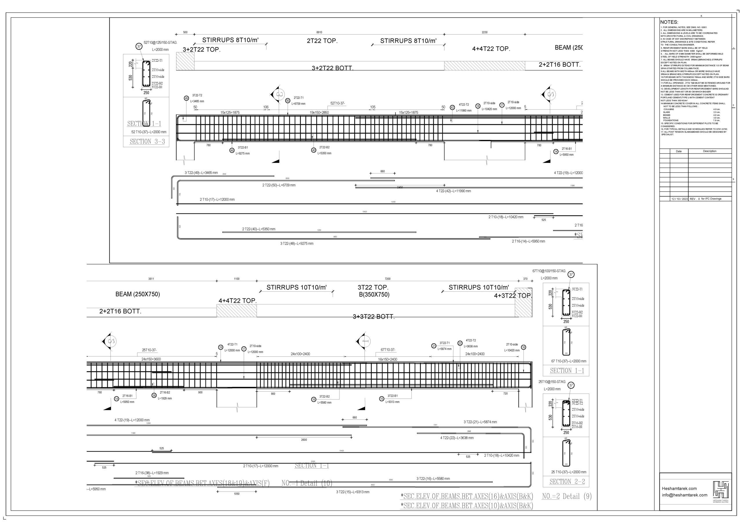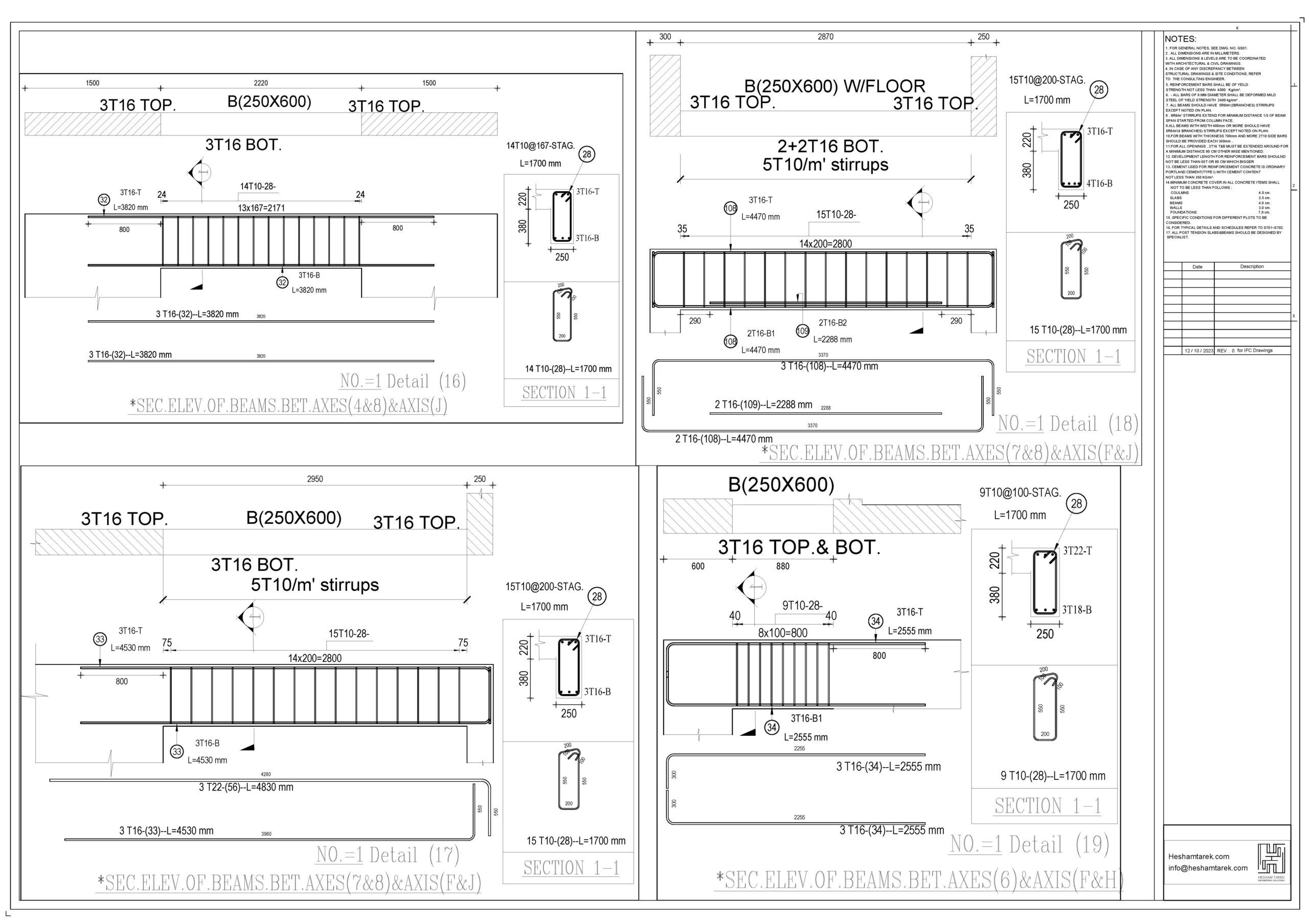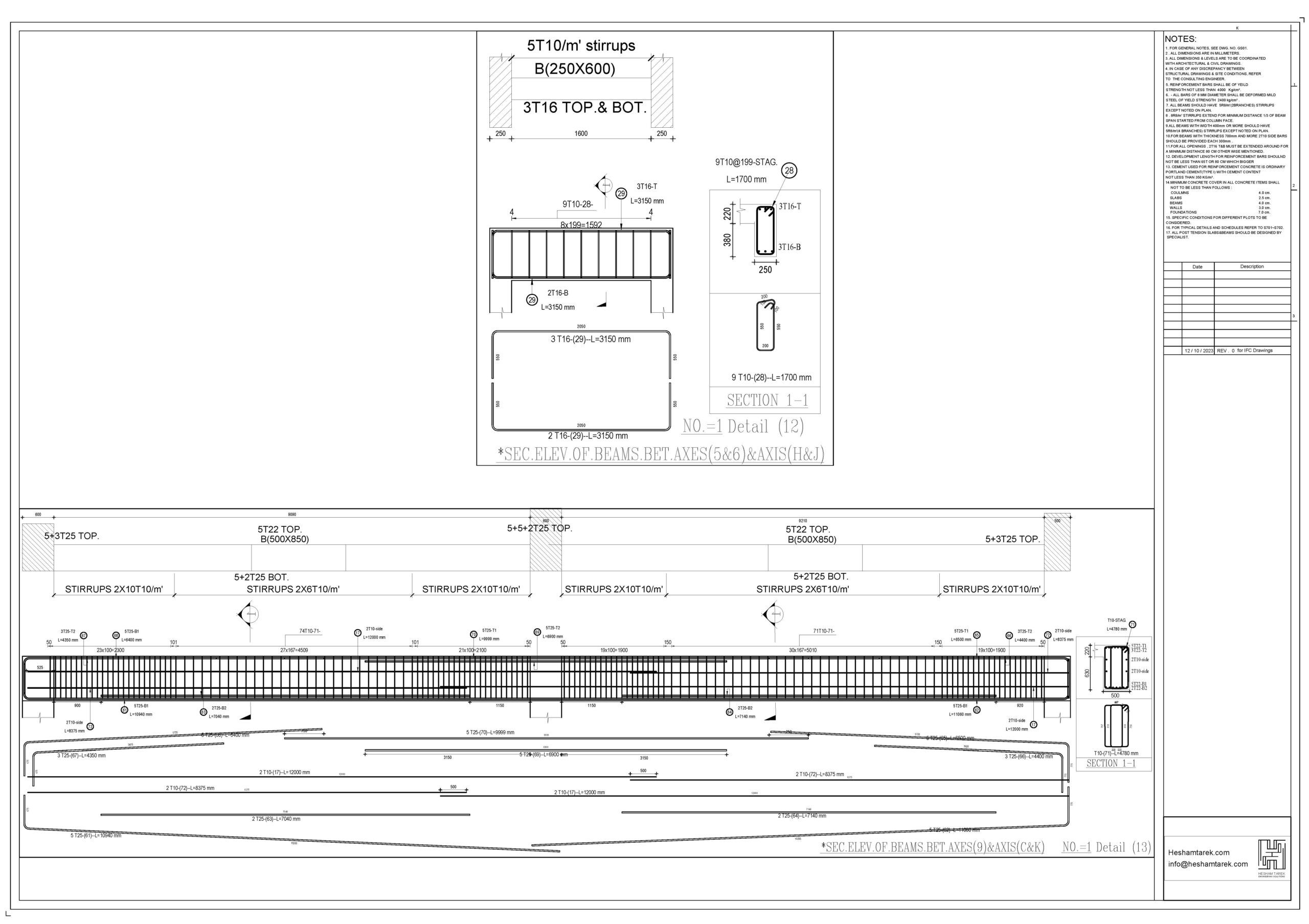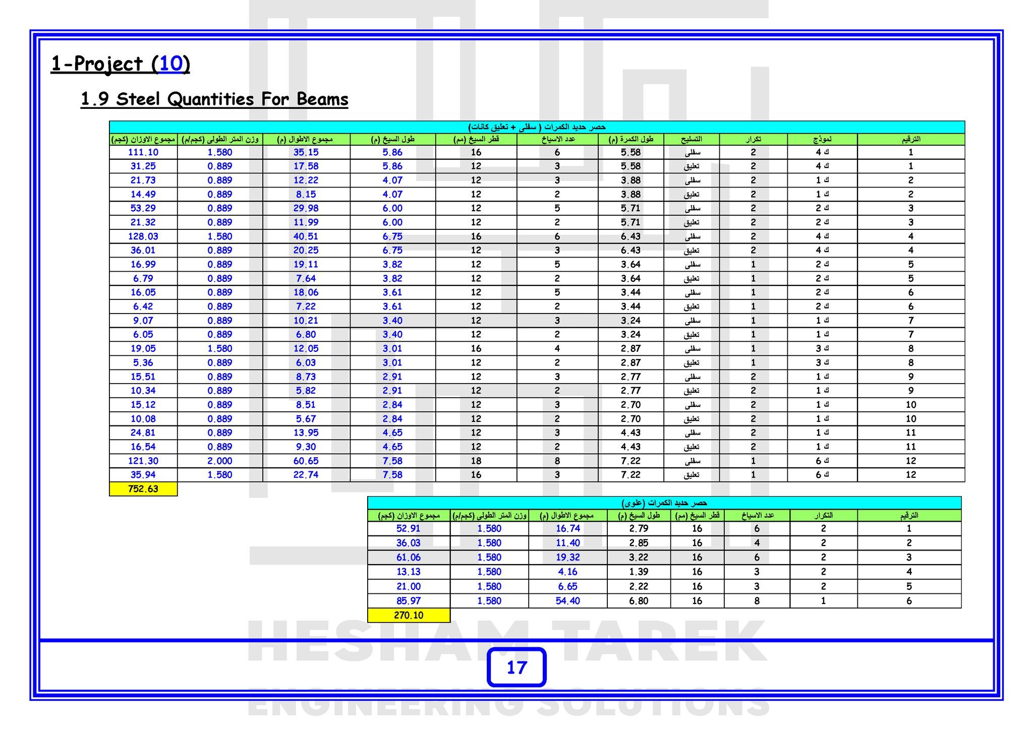 – عمل حصر للكمرات مع توضيح أطوال و سقوط الكمرات و شرح كيفية حصر أكثر من قطاع