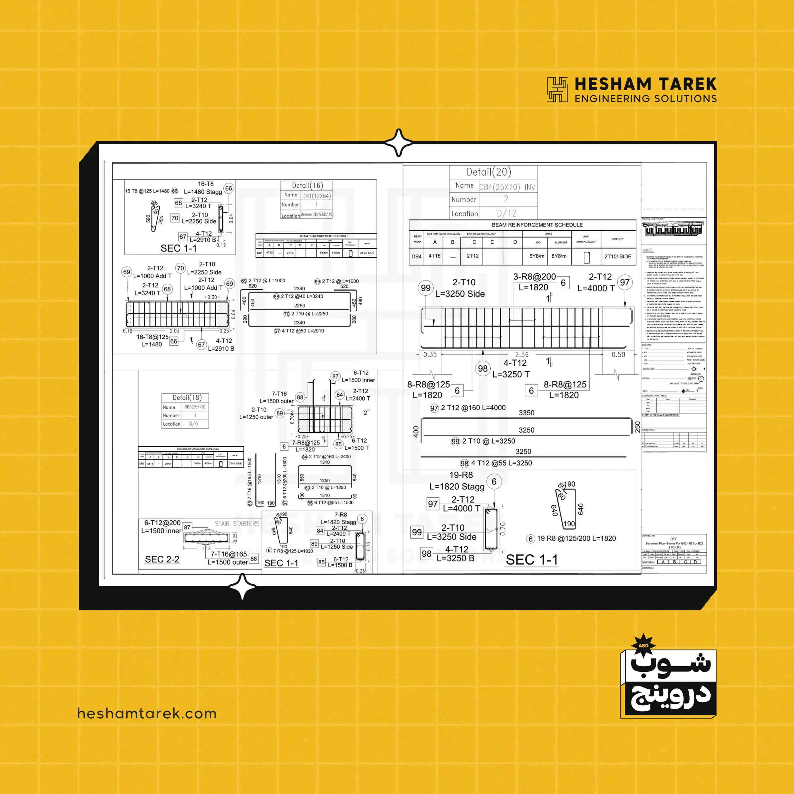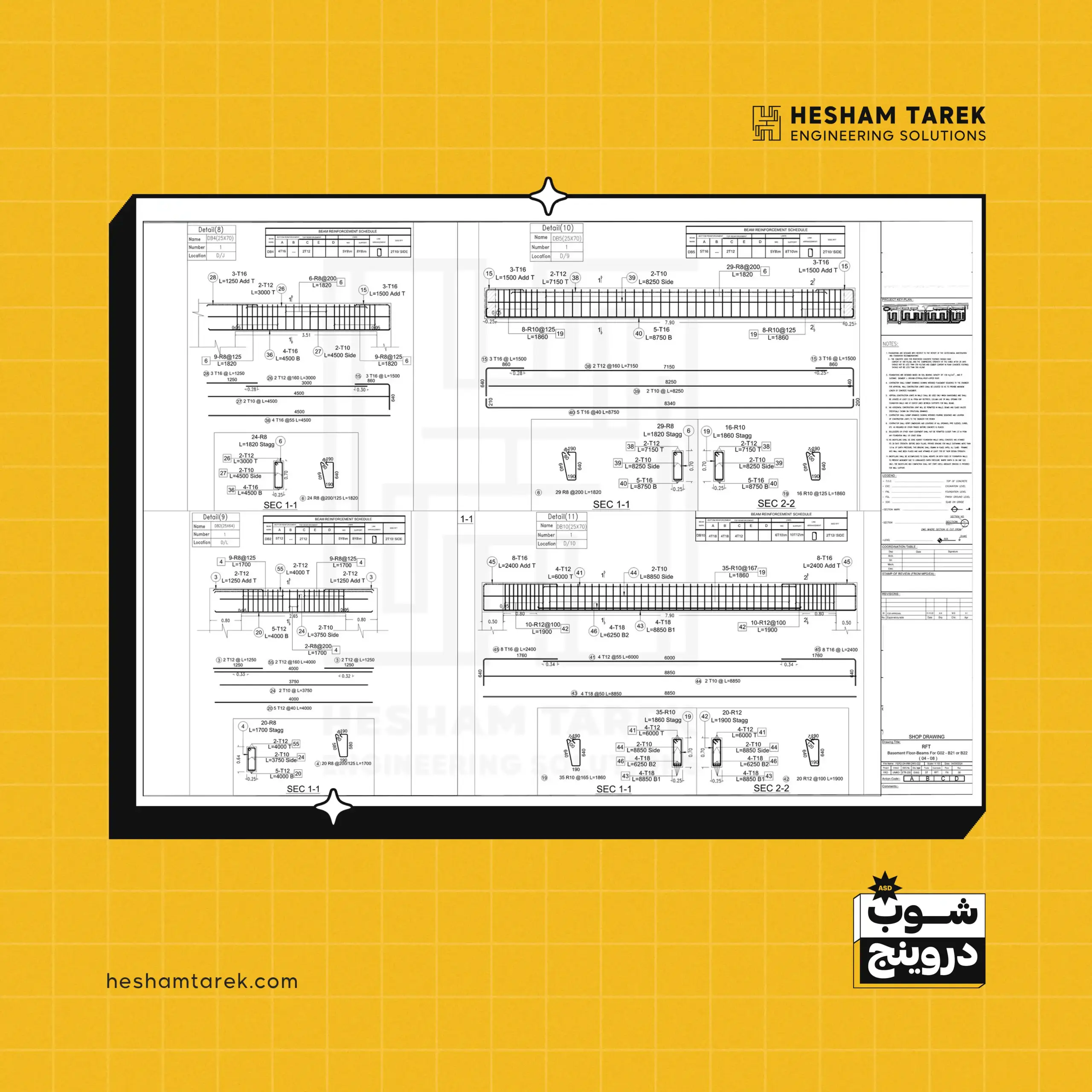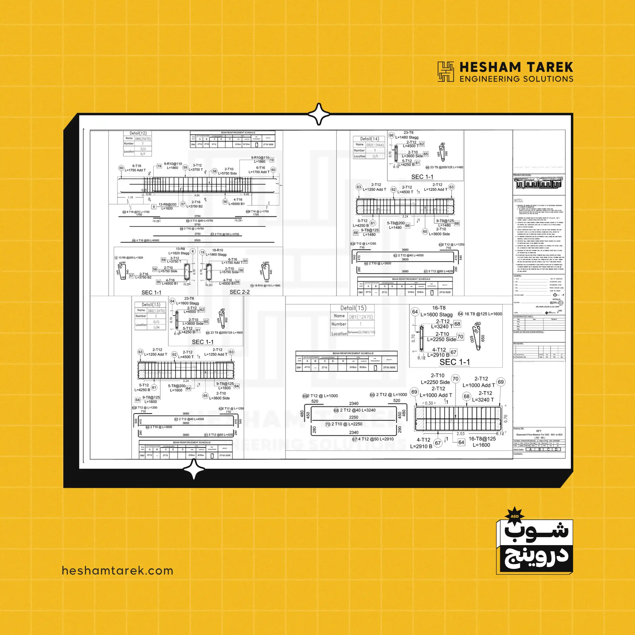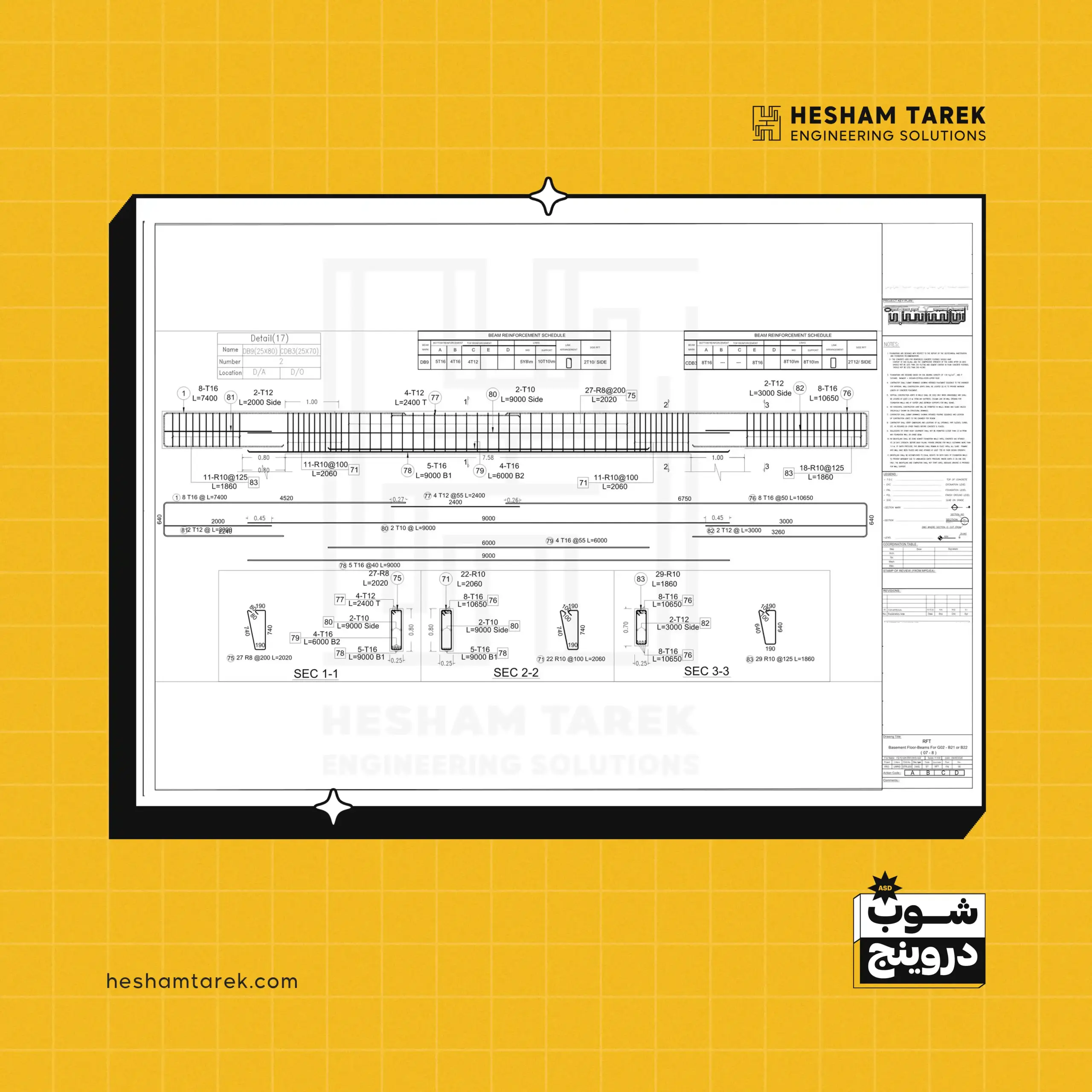 - الكمرات: ساقطة/مدفونة/مقلوبة… تفاصيل التسليح، تكبير/تصغير القطاعات، الفتحات، وعلاقة الكمرات بالعناصر الأخرى.