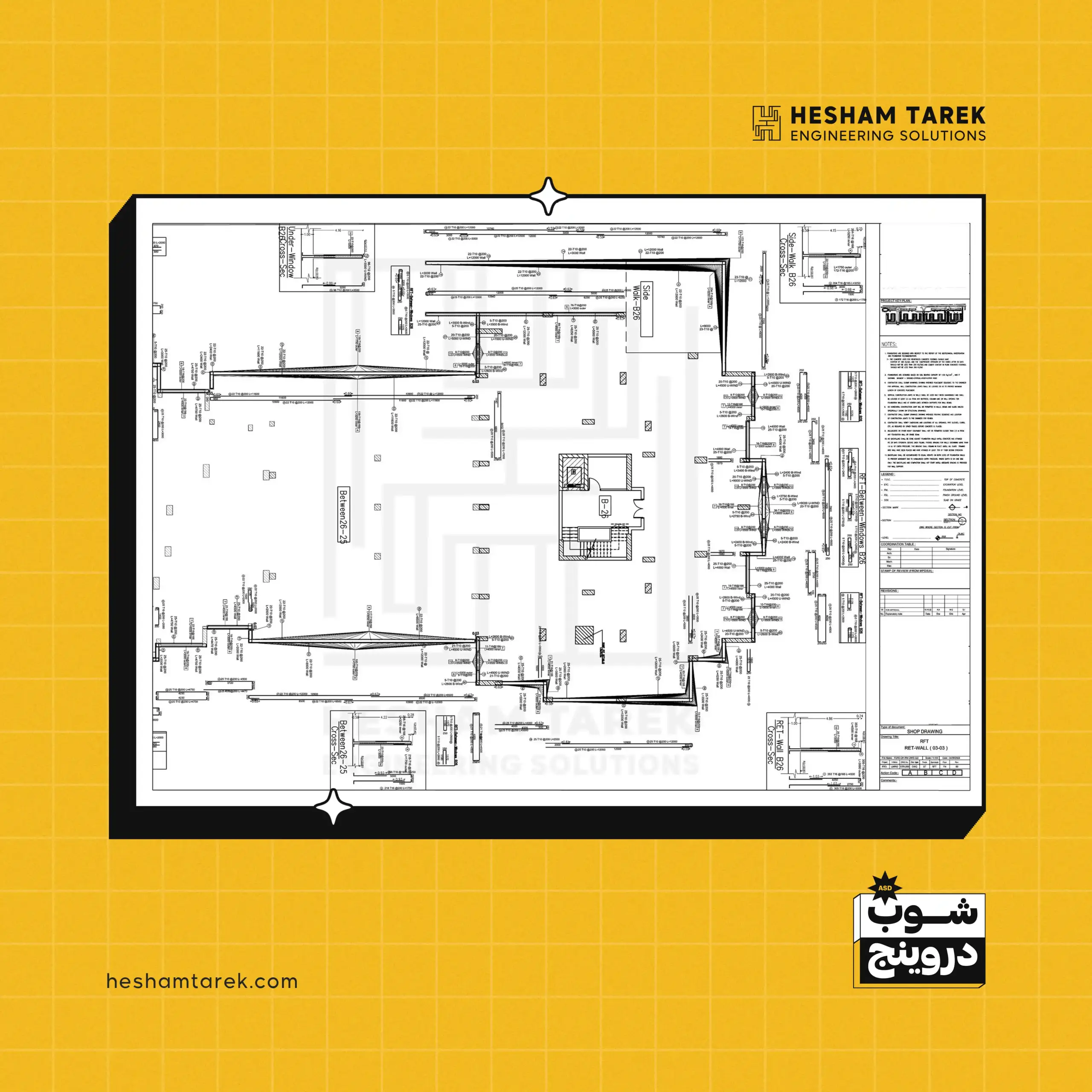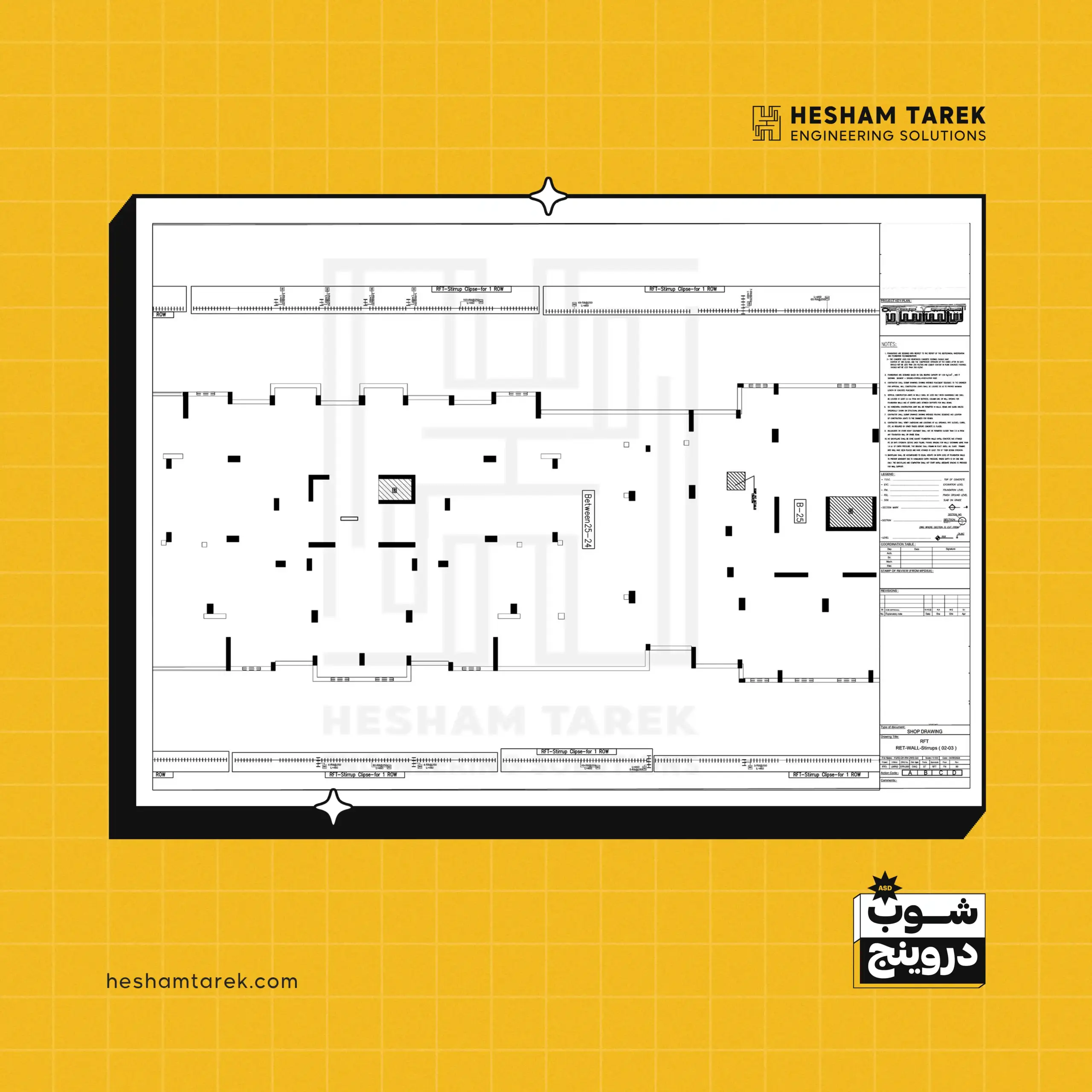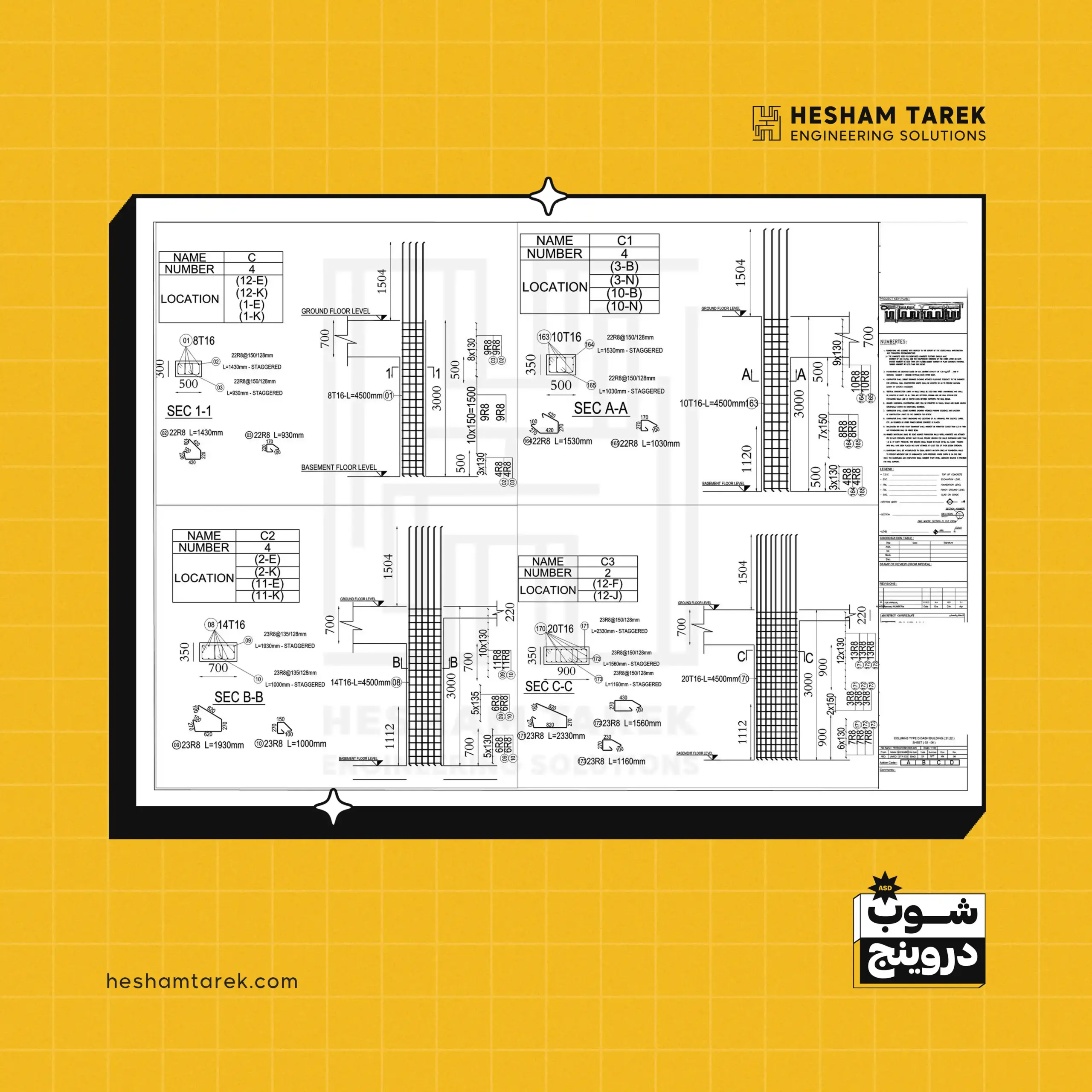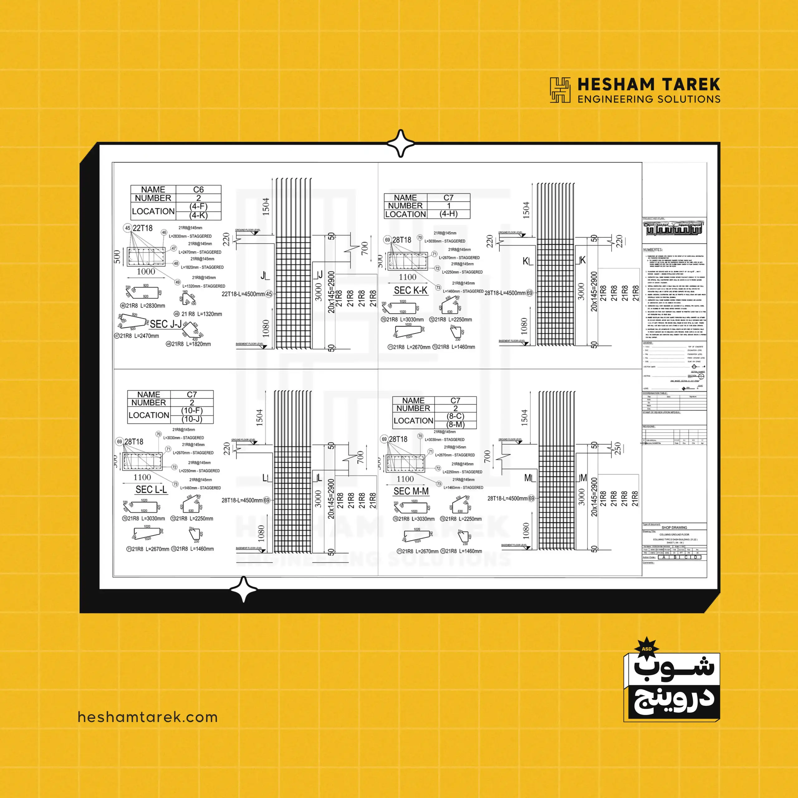 - السملات على منسوب القواعد: اختلافات العرض/القطاعات، السملات غير المستمرة… وإخراج لوحات شوب لكل حالة.
