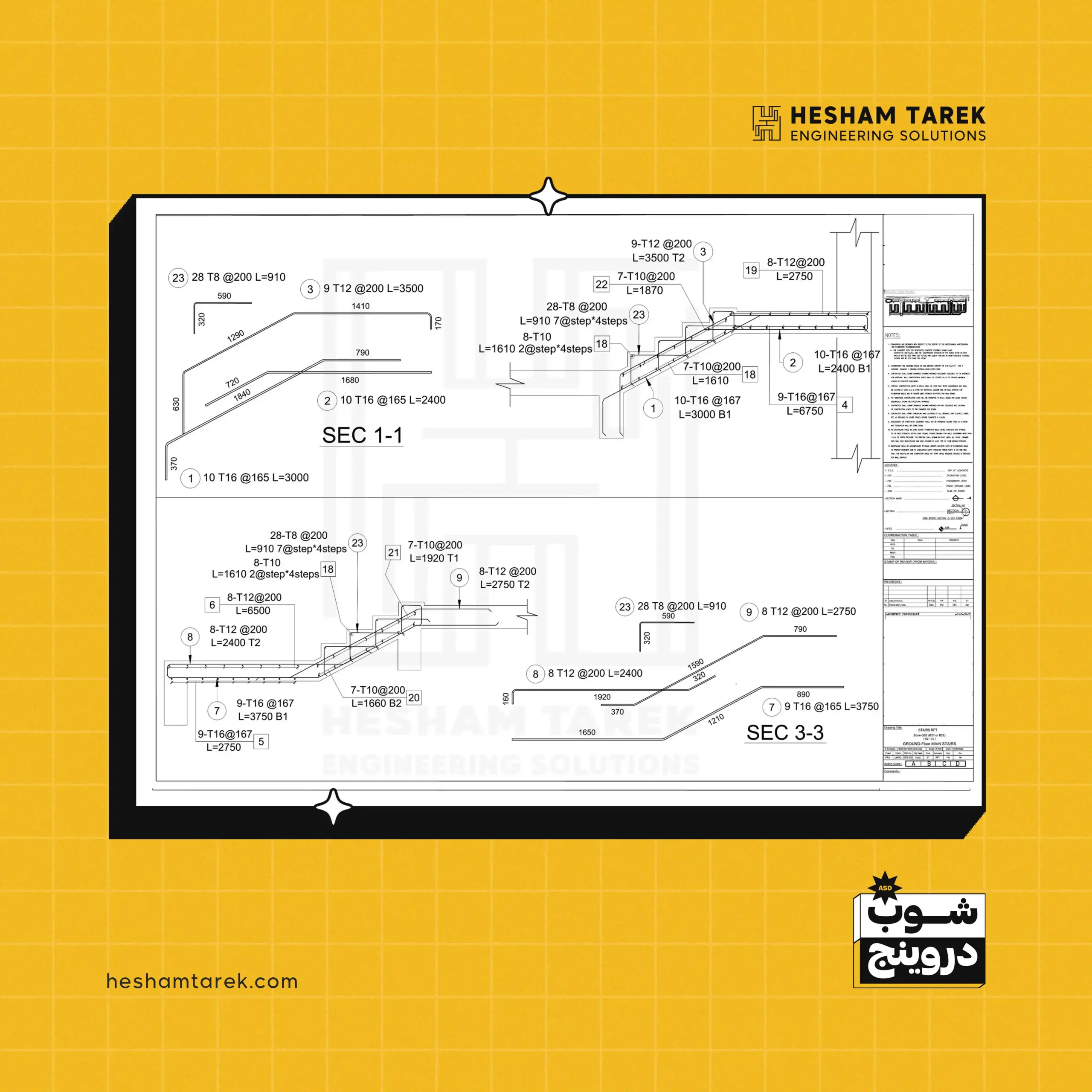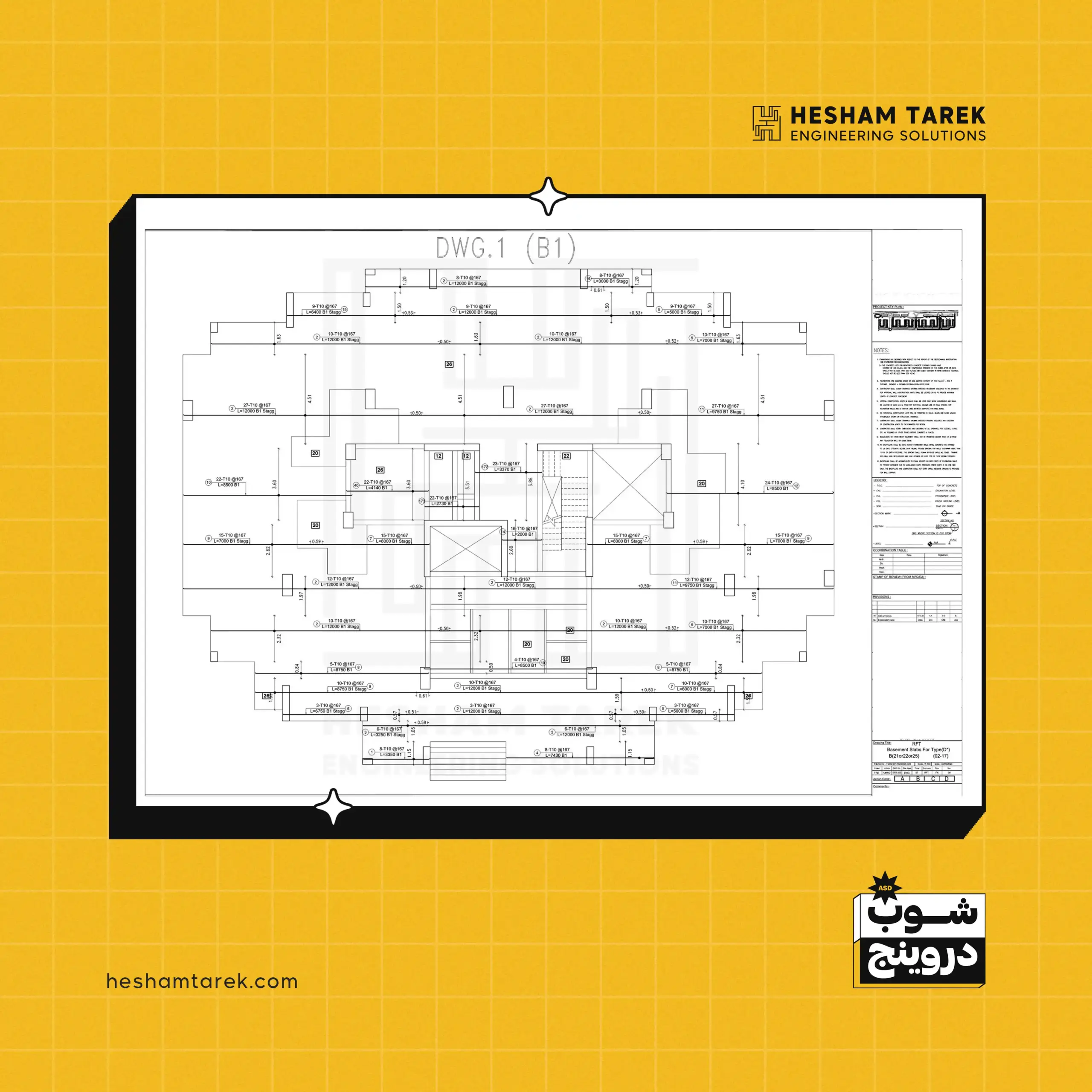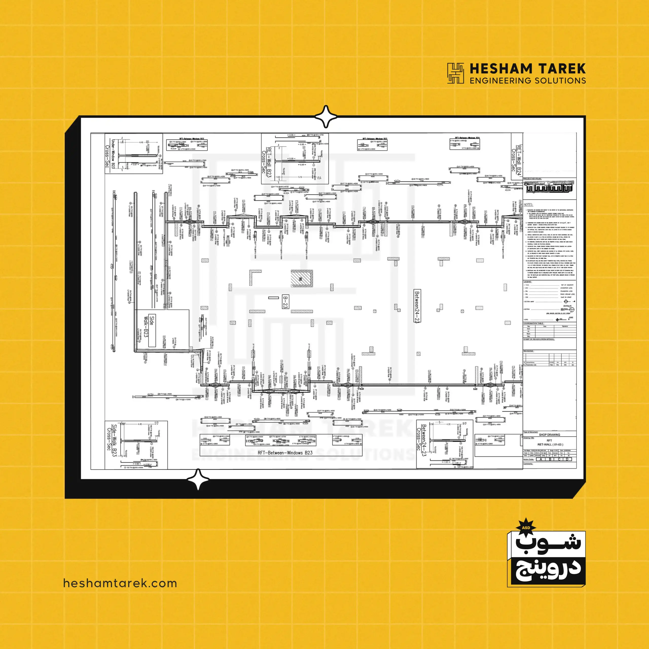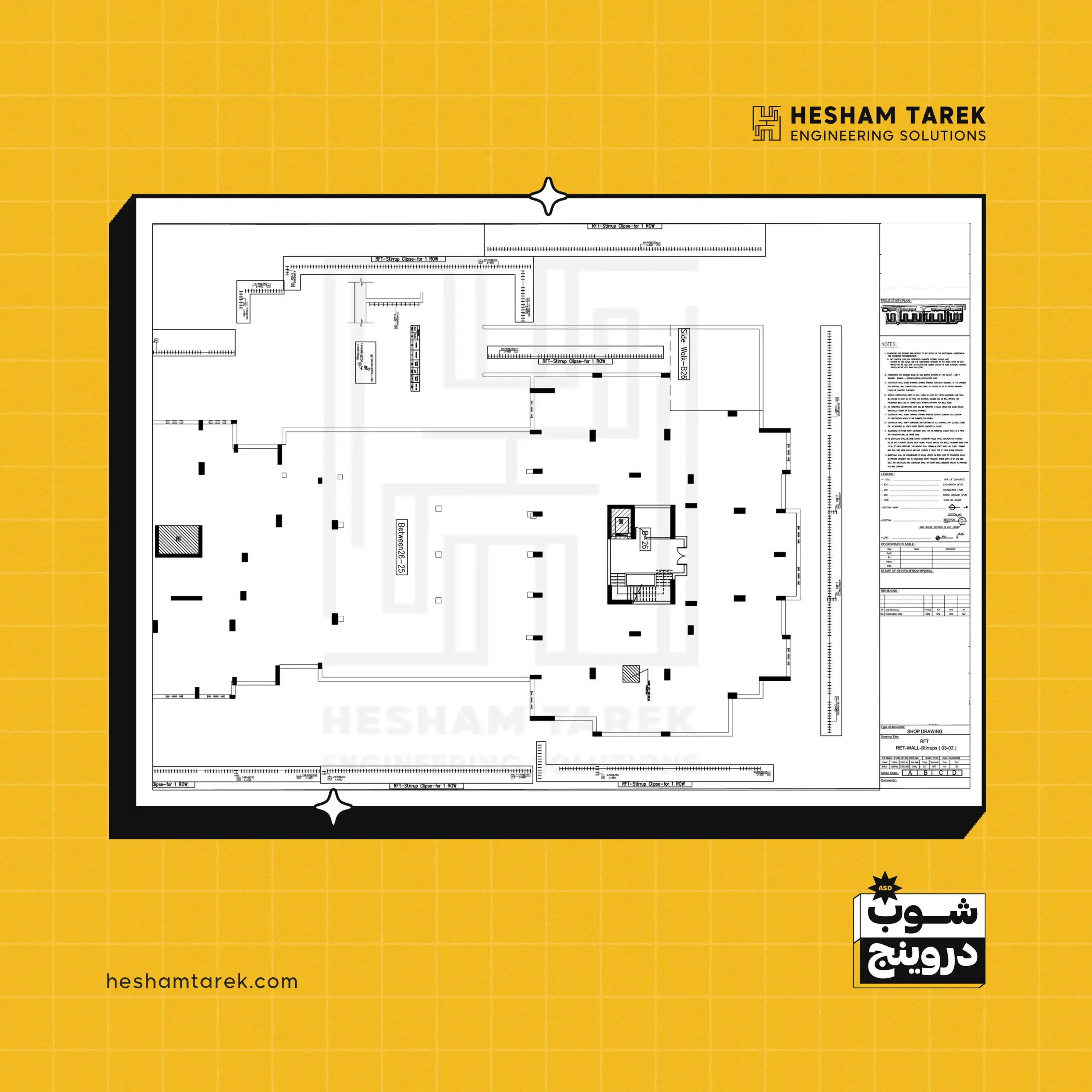 - السملات على منسوب القواعد: اختلافات العرض/القطاعات، السملات غير المستمرة… وإخراج لوحات شوب لكل حالة.