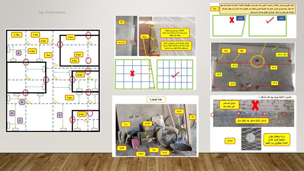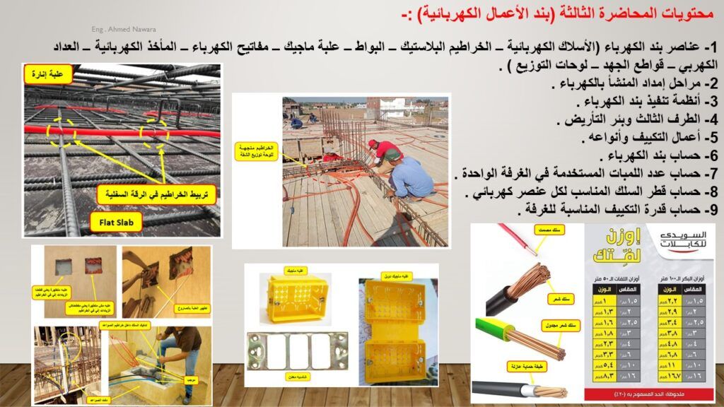 - أعمال الكهرباء: تأسيس الخراطيم – تمديد الكابلات – تركيب اللوحات والمفاتيح والفيش.