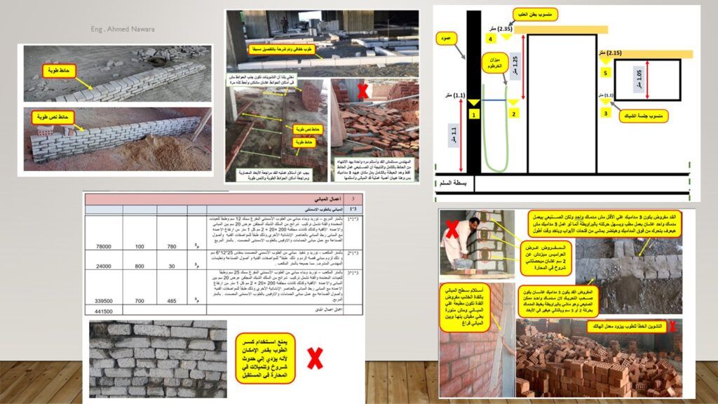 - أعمال المباني: التأكد من التنفيذ طبقًا للمواصفات.