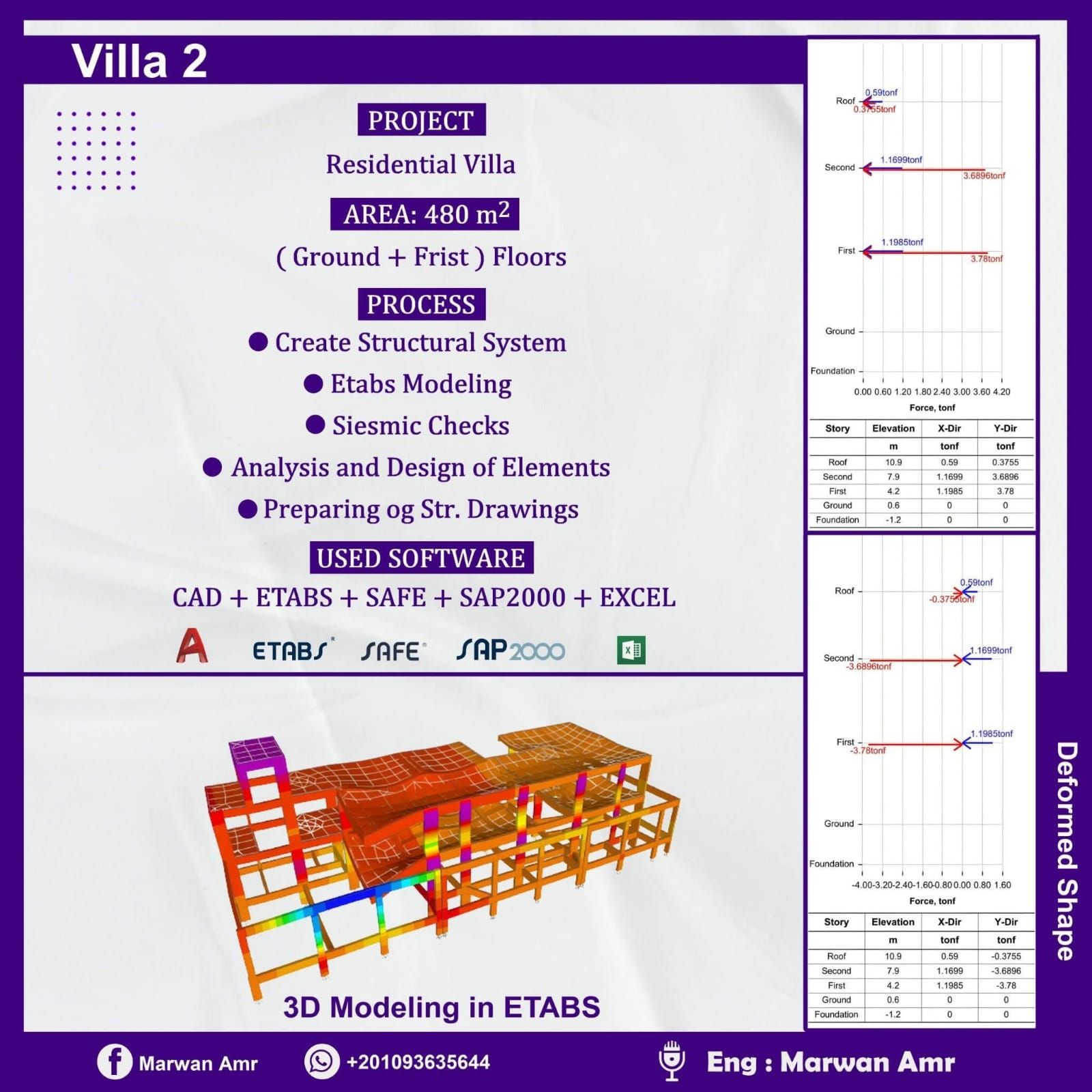 - فيلا سكنية 1 : هنتعلم ازاى نصمم فيلا سكنية (اتنفذت بالفعل في المملكة العربية السعودية) من أول استلام اللوحات المعمارية مرورا بعمل نظام انشائي مناسب وعمل نمذجة علي برنامح ال ETABS تصميم العناصر الرأسية مع تطبيق أحمال الرياح والزلازل ثم التصدير الي برنامج ال SAFE وتصميم الأسقف حتى تجهيز اللوحات الانشائية