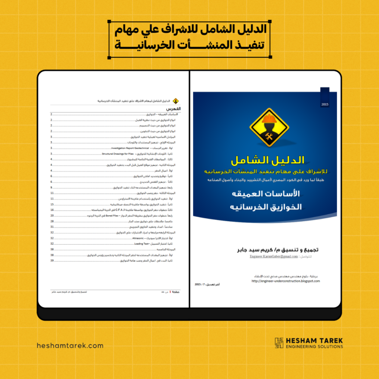 كتاب الدليل الشامل لمهام الإشراف على تنفيذ المنشآت الخرسانية و يحتوي الكتاب علي الاتي الدراسات الجيوتقنية – الخوازيق أنواع الخوازيق…