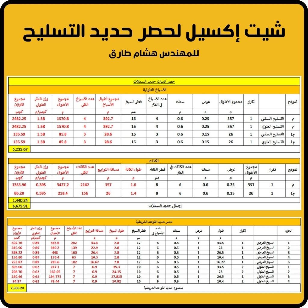 ده شيت إكسيل مجمع هتقدر من خلاله تعمل حصر كميات لكمية الحديد للعناصر الإنشائية المختلفة :